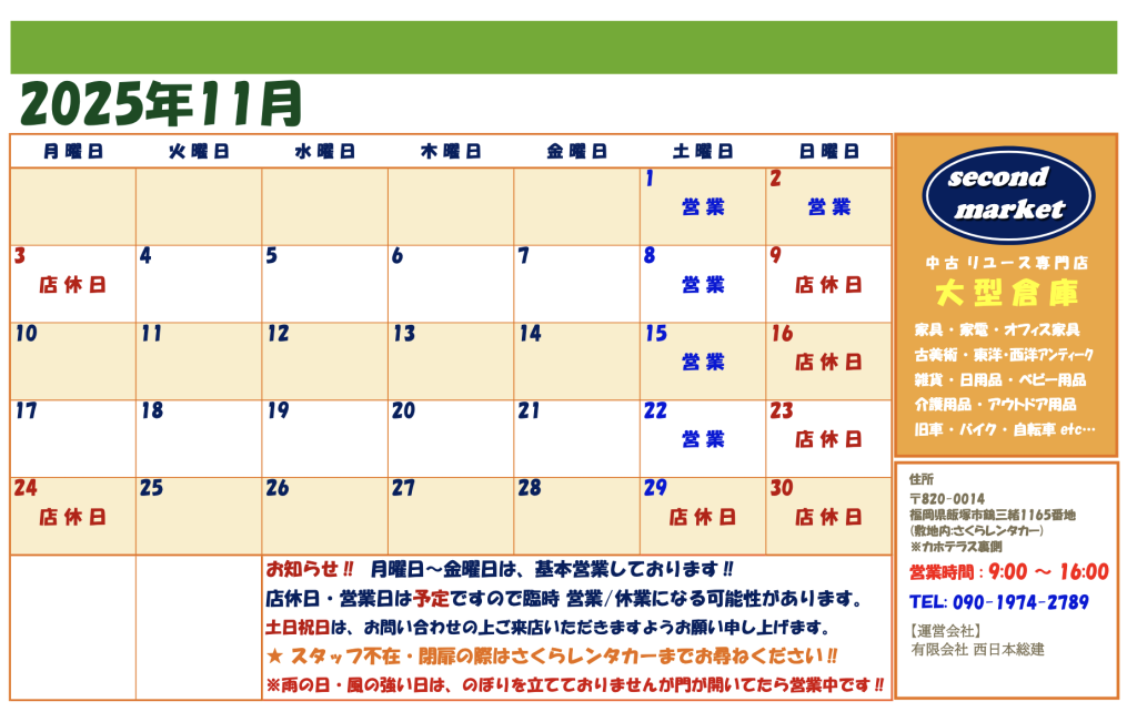 11月営業日カレンダー