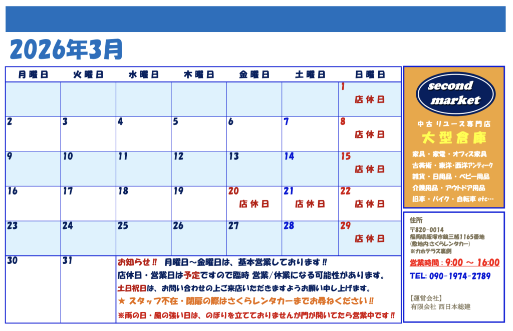3月営業日カレンダー